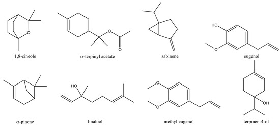 For contents ranging from 7.50% to 1.40%, we identified α-pinene (7.41–3.61%) and eugenol (4.12–1.97%), while β-pinene, α-terpineol, and terpinen-4-ol accounted for (3.81–1.38%), (2.91–0.91%), and (2.33–1.25%), respectively. Seventy-eight components have been identified, represented by bi- and tricyclic oxygenated monoterpenes (BMOs, from 45.38% to 32.38%), followed by bi- and tricyclic monoterpenes (BMs, from 23.66% to 15.79%) and other components such as phenylpropanoids (eugenol, methyl eugenol, elemicin, etc.) from 21.57% to 7.74%. In lower concentrations, monocyclic oxygenated monoterpenes (MMOs, from 17.73% to 12.9 8%) were identified (see Supplementary Materials Table S1). Differences in the composition of the EOs of wild-grown L. nobilis L. in other geographical areas have been reported. However, the main components identified in our samples are in line with the metabolites found in EOs in Italy or in the Mediterranean basin, including a high level of 1,8-cineole [27,90,91]. Figure 1 shows the major constituents of L. nobilis EOs.