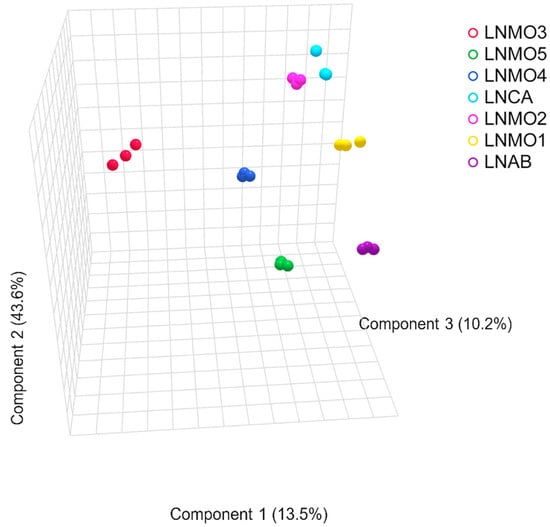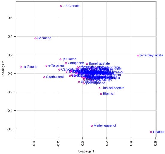 The multivariate analysis was performed by Partial Least Square–Discriminant Analysis (PLS-DA), a “supervised” version of Principal Component Analysis (PCA), which is made aware of the class labels in its input [73]. The essential oils of all of the samples were analyzed in triplicate by GC-MS, and the integrated areas (% area) of the peaks of the metabolites detected were obtained. A data set with 21 observations (7 varieties of Laurus nobilis) and 78 variables (number of metabolites detected) was imported to MetaboAnalyst 6.0, selecting the statistical analysis (one factor). All of the variables were Pareto-scaled to reduce the relative importance of metabolites with high intensities by decreasing large fold changes more than small ones. Additionally, the impact of MS noise is reduced by Pareto scaling [74]. Moreover, the Variable Importance in Projection (VIP) analysis by MetaboAnalyst showed the most important metabolites that contribute to the separation of the clusters, considering metabolites with a VIP value > 1.