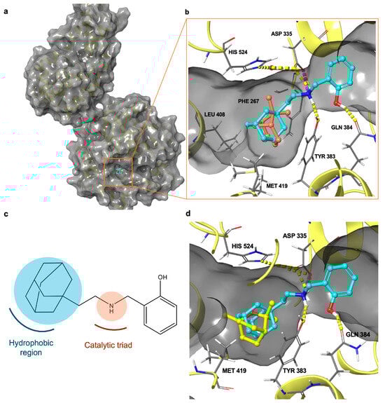 The X-ray crystal structure of sEH in complex with its ligand, 2-({[2-(adamantan-1-yl)ethyl]amino}methyl)phenol, was downloaded from RCSB PDB (ID: 4Y2X [78]) and prepared using Protein Preparation Wizard [79,80] (Schrödinger Suite); the solvent and co-complexed compound were removed, cap termini were included, all hydrogen atoms were added, and bond orders were assigned. The grid box for molecular docking experiments was accounted for using a co-crystallized ligand as a guide to define the centroid of the active site. The final coordinates of the grid center were −17.54 (x), −9.70 (y), and 66.48 (z), and the inner and outer box dimensions were 10 × 10 × 10 and 24.58 × 24.58 × 24.58, respectively.
