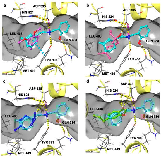 Glide software (version 9.0, Schrödinger, LLC, New York, NY, USA, 2021) [82,83,84,85,86] (Schrödinger Suite) was used for molecular docking experiments, which were conducted in the Extra-Precision (XP) mode. Specifically, during the initial docking phase, 10,000 poses were kept, and 800 conformations were selected for the minimization step with an energy threshold of 0.15 kcal/mol. Finally, a maximum of 20 poses were retained for analysis to examine the binding mode.
