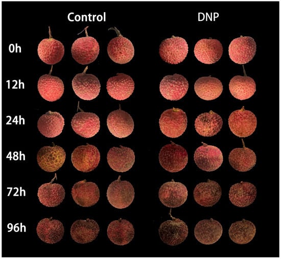 2,4-Dinitrophenol (DNP), as a highly effective mitochondrial uncoupler, can cause protons (H+) to bypass ATP synthase and return directly to the matrix through the mitochondrial membrane, thereby reducing the efficiency of ATP synthesis [25]. This characteristic makes DNP an ideal reagent for studying plant responses under energy-deficient conditions. For example, Kılıç and Dumlupınar studied the cold resistance mechanisms of plants under low-energy conditions by treating corn seeds with DNP [26]. Shu et al. used DNP to treat apples to study the fruit’s stress responses to vibrations during simulated transportation [7]. This study explored the effects of DNP treatment on postharvest browning, energy and sugar metabolism in litchi, aiming to provide a deeper understanding of the regulatory mechanisms that underpin postharvest fruit responses to energy deficiency.