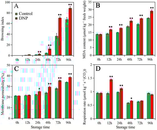 Browning index (A), malonaldehyde (MDA) content (B), membrane permeability (C), and respiration rate (D) in fruit of control and DNP treatment during storage. The data was represented as mean ± standard deviation (n = 3). The asterisk represents the significant difference (* p < 0.05, and ** p < 0.01) between the DNP treatment and control groups.