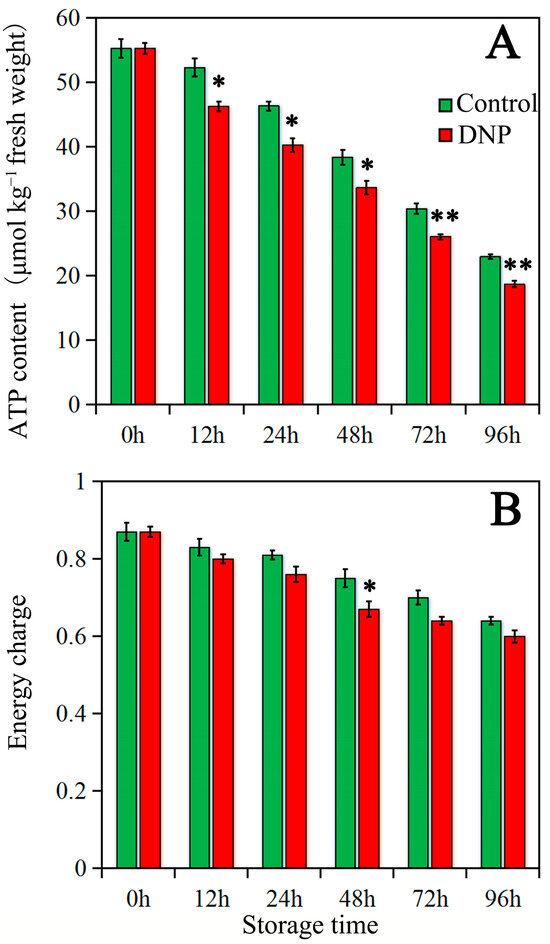The contents of ATP (A) and EC (B) in the fruit of control and DNP treatment during storage. The data was represented as mean ± standard deviation (n = 3). The asterisk represents the significant difference (* p < 0.05, and ** p < 0.01) between the DNP treatment and control groups.