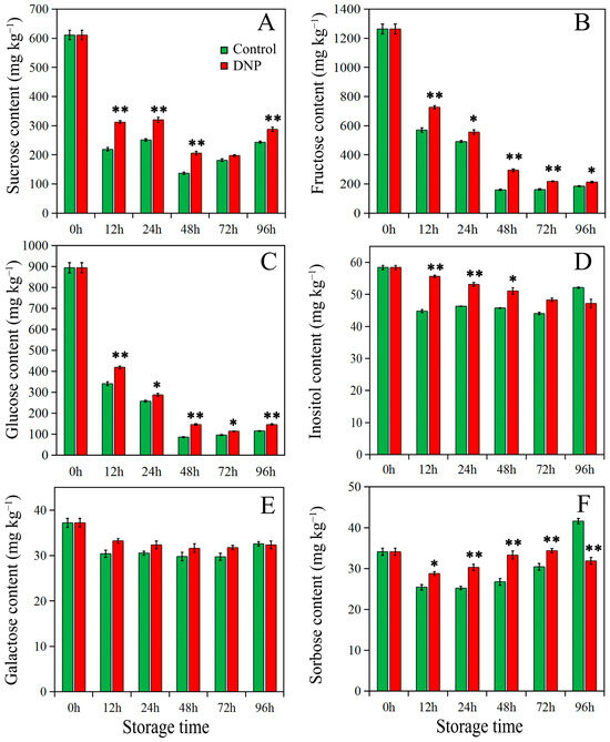 Sugar content ((A), sucrose; (B), fructose; (C), glucose; (D), inositol; (E), galactose; (F), sorbose) in the fruit of control and DNP treatment during storage. The data was represented as mean ± standard deviation (n = 3). The asterisk represents the significant difference (* p < 0.05, and ** p < 0.01) between the DNP treatment and control groups.