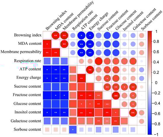 Correlation matrix between the browning index, MDA content, membrane permeability, respiration rate, energy state, and sugar conten. Upper and lower triangles denote the control (circle) and experimental (squar) groups, respectively. Red (+1) indicates the positive correlation and blue (−1) indicates the negative correlation. Asterisk is employed to highlight statistically significant differences (* p < 0.05, ** p < 0.01).