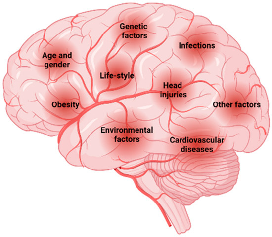 Both AD and PD are associated with a wide range of medical factors that increase the risk of occurrence. Hypertension, high cholesterol, hyperhomocysteinemia, smoking, obesity, infectious environments, excessive alcohol consumption, chronic anemia, traumatic brain injury, and depression are considered significant drivers, along with environmental exposures, for AD [2]. In contrast, in PD, high iron intake, chronic anemia, and traumatic brain injury are identified as significant risk factors. Conversely, hyperuricemia, smoking, and coffee consumption are associated with a lower risk of PD [26]. These medical factors interact in complex ways with genetic predisposition and environmental exposures, adding to the understanding of the multifaceted causes of these NDDs. In addition, aging, and medical conditions such as cardiovascular disease, obesity, and diabetes also increase risk. Cardiovascular diseases such as stroke, atrial fibrillation, and heart failure contribute to neural damage and affect cognitive function, underscoring the importance of a holistic approach to understanding and treating these complex conditions [14,27].