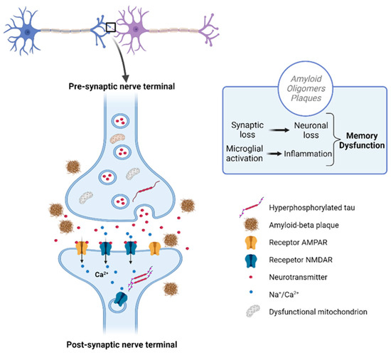 At the initial stages of AD, the symptoms of memory impairment start to show up due to synaptic damage. This can be identified through the evaluation and measurement of synaptic protein activity, such as neurogranin, visinin-like protein-1, and synaptotagmin-1 (Figure 3). Synaptic loss results because of Aβ and tau accumulation at the synaptic sites. Defects in axonal transport, mitochondrial damage, and oxidative stress may also be used as identifiers of synaptic loss [3,31,34]. Besides influencing synaptic loss, the accumulation of Aβ also influences cholinergic neurotransmission, and decreases choline reception and the release of acetylcholine. Acetylcholine has a key role in cognitive function, being involved in many physiological processes such as sensory information, learning, attention, and memory [14].