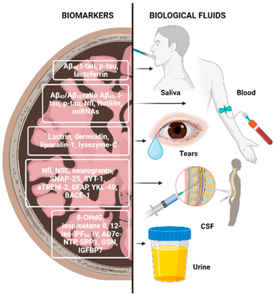 Urine, on the other hand, is easily normalized and represents a good biological fluid as a source of biomarkers for the diagnosis and monitoring of renal dysfunctions. Oxidative stress and oxidative DNA damage play important roles in the early stages of AD, as reactive oxygen species (ROS) combined with mitochondrial and nuclear DNA leads to 8-hydroxy-2′-deoxyguanosine (8-OHdG) production, and that can be used to monitor cellular dysfunction in urine. Isoprostane 8, 12-iso-iPF2α-IV results from arachidonic acid peroxidation by free radicals and is found elevated in AD patients. Urinary Alzheimer-associated neuronal thread protein is a transmembrane phosphoprotein that co-localizes with NFT, and it is associated with tau accumulation in AD patients. In recent studies, three differentially expressed proteins were identified in the urine of AD patients: secreted phosphoprotein 1, involved in modulation of macrophage immunological profile for a better ability to mediate Aβ clearance; gelsolin, which binds to Aβ, solubilizes its fibrils and inhibits fibrillization in the brain; and insulin-like growth factor-binding protein-7, which is a key mediator of memory function and contributes to cell homeostasis [32].