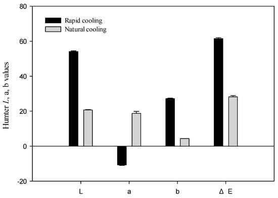 Two different cooling methods for green tea infusion are shown in Figure 1. The color of the green tea infusions exhibited significant differences between the rapid and natural cooling methods we tested during this study (Figure 2). The L-values, representing lightness, were higher in the rapid cooling green tea infusion (L = 54.13) than in the natural cooling green tea infusion (L = 20.68). The a-values, indicating redness-greenness, were lower in the rapid cooling green tea infusion (a = −10.71) than in the natural cooling green tea infusion (a = 18.73). The b-values, representing yellowness-blueness, were higher in the rapid cooling green tea infusion (b = 27.19) than in the natural cooling infusion (b = 4.53). Moreover, the ΔE-values, indicating the overall color difference, were more significant in the rapid cooling infusion (ΔE = 61.51) than in the natural cooling infusion (ΔE = 28.25).