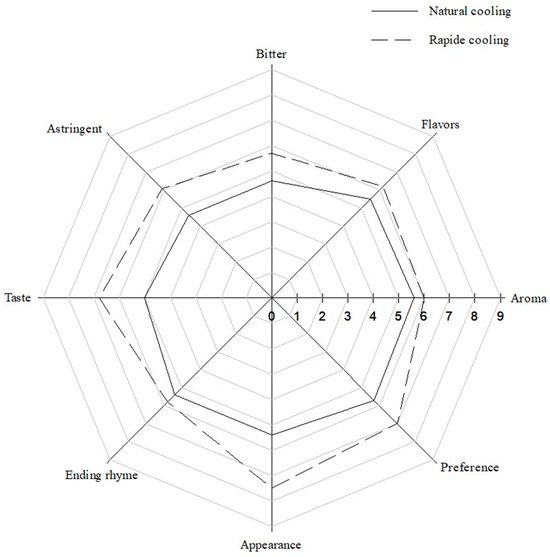 Radar chart of consumers’ acceptance of tea sensory evaluation under rapid and natural cooling.
