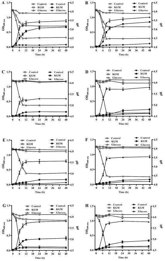 The activated strains with an inoculum volume of 2% (v/v) were inoculated into an MRS liquid medium containing 0.5% (w/v) KGM as the sole carbon source. The culture was mixed thoroughly and incubated at a constant temperature of 37 °C. The optical density of the bacterial suspension was measured at 600 nm at 0, 3, 6, 9, 12, 24, and 48 h post-inoculation. Subsequently, the bacterial suspension was centrifuged at 1700× g for 10 min, and the supernatant was collected to determine the pH. A medium devoid of a carbon source served as the negative control, while a medium with glucose as the carbon source was used as the positive control.