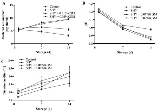 Bacterial cell numbers (A), pH (B), and titration acidity of yogurt (C). Control: the yogurt with only the addition of the starter culture; SHY: the yogurt with the addition of the starter culture and SHY130; SHY + 0.01% KGM: the yogurt with the addition of the starter culture, SHY130, and 0.01% KGM; SHY + 0.02% KGM: the yogurt with the addition of the starter culture, SHY130, and 0.02% KGM.