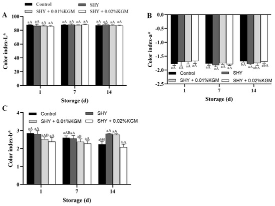 Changes in the color of yogurt during storage. (A) Color index L*, (B) color index a*, and (C) color index b*. Control: the yogurt with only the addition of the starter culture; SHY: the yogurt with the addition of the starter culture and SHY130; SHY + 0.01% KGM: the yogurt with the addition of the starter culture, SHY130, and 0.01% KGM; SHY + 0.02% KGM: the yogurt with the addition of the starter culture, SHY130, and 0.02% KGM. The means of varying storage times, indicated by varying uppercase letters (A,B), exhibit significant differences (p < 0.05); the means of varying yogurts, indicated by the lowercase letters (a,b), exhibit significant differences (p < 0.05).