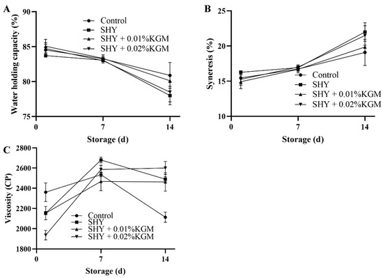 Changes in the water-holding capacity (A), syneresis (B), and viscosity (C) of yogurt during storage. Control: the yogurt with only the addition of the starter culture; SHY: the yogurt with the addition of the starter culture and SHY130; SHY + 0.01% KGM: the yogurt with the addition of the starter culture, SHY130, and 0.01% KGM; SHY + 0.02% KGM: the yogurt with the addition of the starter culture, SHY130, and 0.02% KGM.
