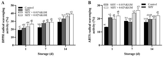 DPPH (A) and ABTS (B) free radical scavenging ability of yogurt. Control: the yogurt with only the addition of the starter culture; SHY: the yogurt with the addition of the starter culture and SHY130; SHY + 0.01% KGM: the yogurt with the addition of the starter culture, SHY130, and 0.01% KGM; SHY + 0.02% KGM: the yogurt with the addition of the starter culture, SHY130, and 0.02% KGM. The means of varying storage times, indicated by different uppercase letters (A–C), exhibit significant differences (p < 0.05); the means of varying yogurts, indicated by different lowercase letters (a–c), exhibit significant differences (p < 0.05).