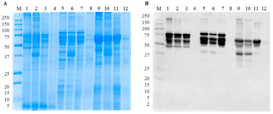 Protein profile and IgG binding capacity of γ-conglutin by SDS-PAGE in non-reducing conditions (A) and immunoblot membranes using anti-γ-conglutin polyclonal antibody (B). Legend: lane M, Precision Plus Protein Dual Xtra Prestained Protein Standards 2–250 kDa (Bio-Rad Laboratories, Inc., Hercules, CA, USA); lane 1, L. luteus flour; lane 2, raw pasta containing 35% of L. luteus; lane 3, boiled pasta containing 35% of L. luteus; lane 4, water from L. luteus boiling pasta; lane 5, L. angustifolius flour; lane 6, raw pasta containing 35% of L. angustifolius; lane 7, boiled pasta containing 35% of L. angustifolius; lane 8, water from L. angustifolius boiling pasta; lane 9, L. albus flour; lane 10, raw pasta containing 35% of L. albus; lane 11, boiled pasta containing 35% of L. albus; lane 12, water from L. albus boiling pasta.