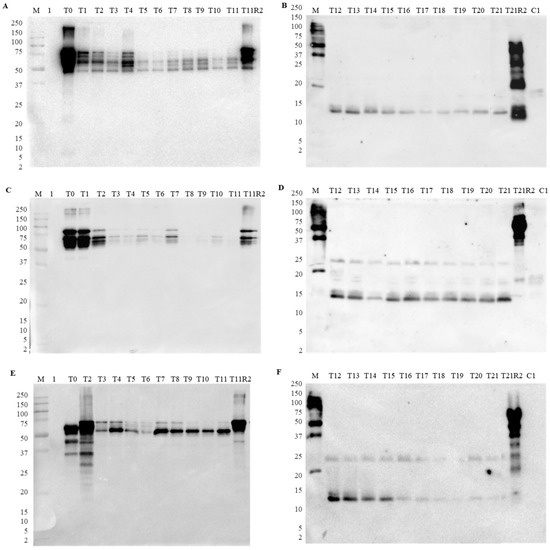 The time-dependent course of GI digestion was monitored by SDS-PAGE (Figure S1) and immunoblotting (Figure 2). Following the progress of the gastric phase, a continuous degradation of all protein bands was generally observed in all lupine species (Figure S1A,C,E). Similarly, immunoblotting results showed a decrease in the IgG binding of γ-conglutin, especially in L. luteus (Figure 2A) and L. angustifolius (Figure 2C). All bands below 50 kDa were degraded during gastric digestion, meaning that disulfide-linked subunits (mostly between 50 and 75 kDa) retained their immunoreactivity even after pepsin degradation, remaining observable until the end of the gastric phase (Lane T11, Figure 2A,E). However, in the case of L. angustifolius, IgG binding was almost completely abolished at the end of gastric digestion (lane T11, Figure 2C).