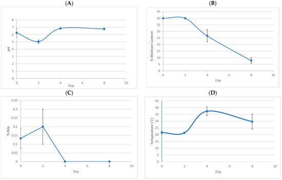Characteristics of coffee during fermentation. (A) pH; (B) % Moisture content on wet basis; (C) % Brix; (D) Temperature at the site during the wet fermentation process (Days 0 and 2) and drying process (Days 4 and 8).