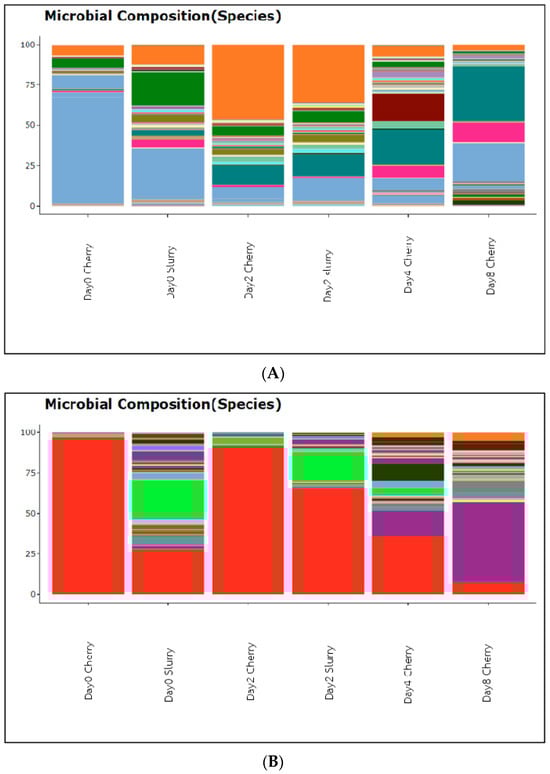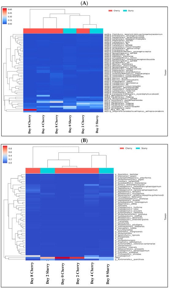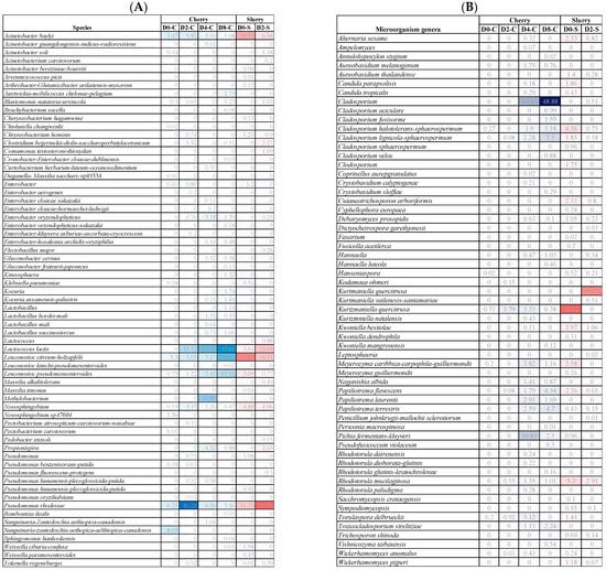 Dynamics of microbial communities during fermentation: (A) Bacteria; (B) Fungi and Yeast. Cherry samples were collected at Days 0, 2, 4, and 8 and denoted as D0-C, D2-C, D4-C, and D8-C, respectively. Slurry samples during fermentation were taken at Day 0 (D0-S) and 2 (D2-S). The numbers represent the % coverage of each species, the intensity represents the amount while blue and red represent the comparison for cherry and slurry, respectively.