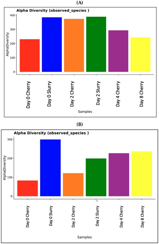 Alpha diversity was measured for (A) bacterial and (B) fungal and yeast diversity of each sample. The plot indicates the number of observed species in the samples. For analyses without group comparison, a histogram of observed species in each sample is shown.