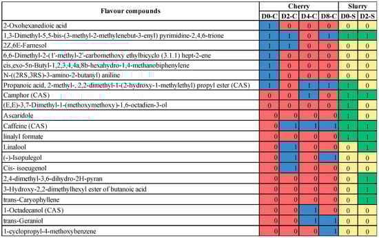 Changes in flavor compounds during fermentation where the number 1 indicates flavors detected in cherry (blue) and slurry (green), while the number 0 indicates flavors that were not detected in cherry (red) and slurry (yellow).