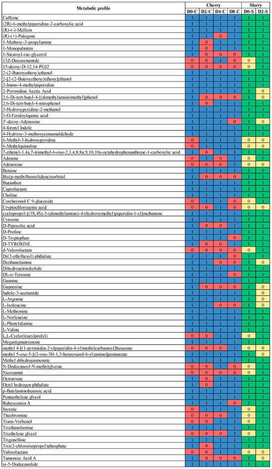 Changes in metabolic profile during fermentation. Compounds that were detected are denoted with the number 1 for cherry (blue) and slurry (green), while the number 0 indicates compounds not detected in cherry (red) and slurry (yellow).