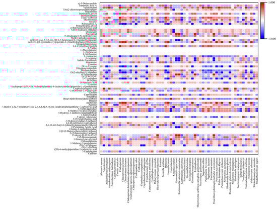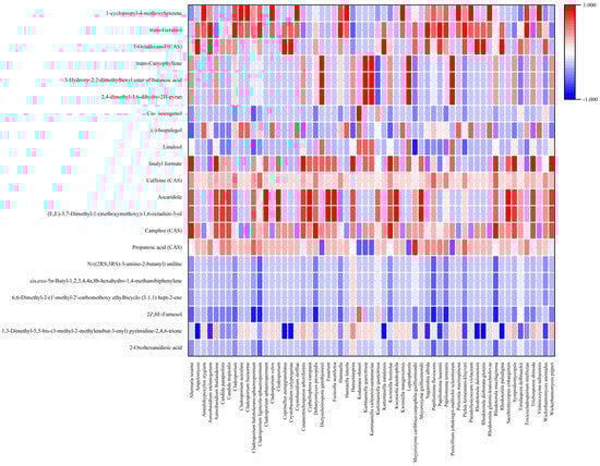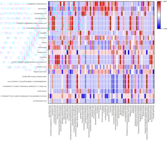 The correlation between microbial profile and flavor/aroma compounds is shown in Figure 8 and Figure 9. Camphor (CAS), mainly of Camphoreous aroma, was positively correlated with yeast/fungi such as Alternaria sesame, Debaryomyces prosopidis, Kwoniella bestiolae, and Rhodotorula mucilaginosa (p > 0.7) []. Camphor is associated with woody, soapy, and fatty aromas and appears mainly when lactic acid bacteria are not predominant. Camphor has been reported to have anti-tumor activity in mice []. Compounds of linalyl formate produce aromas of citrus, herbal, bergamot, and lavender and are associated with three types of bacteria (Acinetobacter baylyi, Chryseobacterium hominis, Novosphingobium sp.) and nine types of yeast/fungi (Alternaria sesame, Aureobasidium thailandense, Cutaneotrichosporon arboriformis, Hanseniaspora, Kwoniella bestiolae, Rhodotorula mucilaginosa, Sympodiomycopsis sp., Trichosporon shinoda, Wickerhamomyces pijperi). Linalool, with aromas of citrus, floral, sweet bois de rose, and blueberry was negatively correlated with Meyerozyma caribbica-carpophila-guilliermondii. However, it was remarkably positively correlated with bacterial species Blastomonas natatoria-ursincola, Clostridium beijerinckii-diolis-saccharoperbutylacetonicum, Pseudomonas rhodesiae, and Yokenella regensburgei. Cis-isoeugenol, with aromas of sweet spicy, carnation, and floral, was only positively correlated with one type of yeast (Kodamaea ohmeri) and six types of bateria, which mainly belong to the family of Enterobacteriaceae sp., Pectobacterium sp., and Pseudomonas sp. Trans-geraniol, that produces sweet floral, fruity, rose, and citrus aromas, was positively correlated with Aureobasidium melanogenum, Cladosporium sp., Clalignicola-sphaerospermum, Hannaella sp., Naganishia albida, Papiliotrema laurentii, Papiliotrema terrestris, Pichia fermentans-kluyveri, Enterobacter sp., Gluconobacter sp., Kocuria sp., and lactic acid bacterias. However, a remarkable negative correlation was found between trans-geraniol and Acinetobacter baylyi (reported p value of −0.828). The compound (-)-isopulegol is associated with a minty cooling flavor, but was not correlated with Pichia fermentans-kluyveri, Enterobacter sp., Leuconostoc pseudomensenteroides, or Pseudomonas rhodesiae in this study. However, it was also not significantly affected by any type of microbes (−0.7 < p < 0.7).