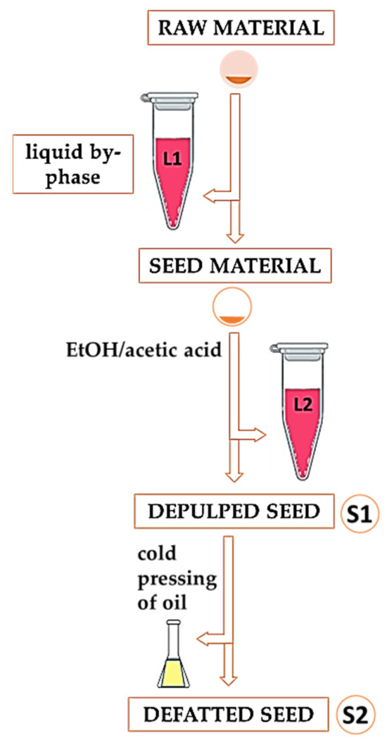 Raspberry seeds were collected from a small juice manufacturer in Serbia. The integrated production was organized on Kopaonik Mountain (central part of Serbia), at 700 m of altitude. The standard cultural practice was applied in the orchard. The fully ripened fruits of the Willamette raspberry cultivar were used for juice production. The experiment was designed to use both depulped seed (S1) and defatted seed cake (S2), to recover anthocyanins from the pulp residue. For this purpose, the raspberry seed sample was processed in such a way that both the solid phase and the liquid by-phase phase were fully utilized in each step of the entire procedure. In other words, no filtrates or solid residues were discarded. The workflow for the processing of samples S1 and S2 as well as the liquid by-phases L1 and L2 is shown in Figure 1.