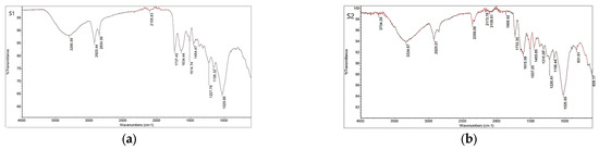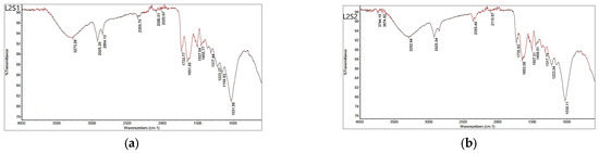 Differences in the position and intensity of the band at around 815 cm−1 indicate that the biosorption processes of a liquid by-phase L2 could alter the phenolic acid content in the seed after sorption, i.e., compared to seed sample S1, the intensity of this band is higher in L2S1 than in S1. The spectra with the higher intensity of the band at around 1528 and 1613 cm−1 could indicate a slightly higher content of polyphenols in L1S2 than S2. Compared to S1 and S2, samples L1S1 and L1S2 show a higher intensity of the band at approximately 1125 cm−1, which could indicate a higher concentration of carbohydrates. The band at 1732 cm−1 could indicate fatty acid esters, which are only found in the seed samples S1 and S2 [24].