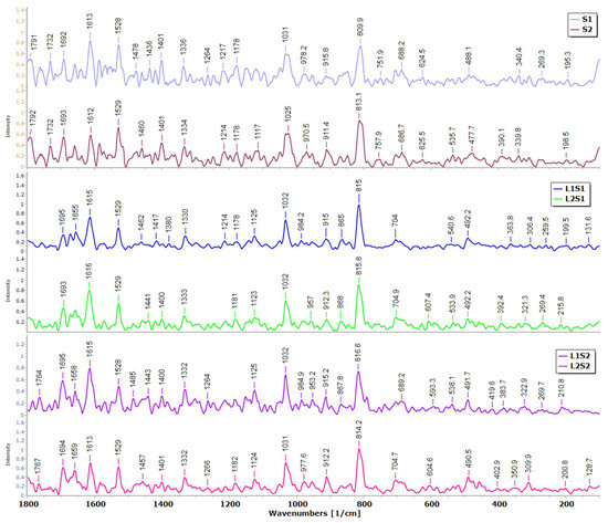 We also investigated whether Raman spectroscopy can be used to unambiguously identify the chemical composition of seeds and possible changes through experimentation. We collected 60 spectra of 6 sample types (S1, S2, L1S1, L2S1, L1S2, and L2S2). The Raman spectra of the seed samples (Figure 5) can be considered as fingerprints of the samples and are closely related to their chemical composition. According to the Raman spectra, the raspberry seeds exhibit vibrational bands that can be assigned to phenolic acids (815 cm−1), polyphenols (1032, 1400, 1528, 1615, and 1655 cm−1), proteins or fatty acids (1264, 1443, and 1650 cm−1), and carbohydrates (915, 984, and 1125 cm−1). Band position and intensity (Figure 5 and Table 3) of the seed samples indicate the predominance of phenolic acids, anthocyanidins, and other polyphenols [21,22,23]. Differences in the position and intensity of the band.