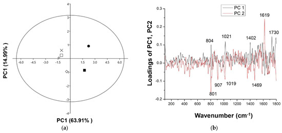 PCA applied to the data obtained from Raman spectra of raspberry seed samples: (a) score plot and (b) loading plots. (S1-closed cycle, L1S1-plus, L2S1-open square, S2-closed square, L1S2-exs, L2S2-rhombus).