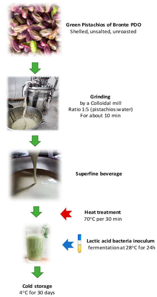 The procedure for the preparation of the fermented pistachio-based beverage is illustrated in Figure 1. Briefly, 1 kg of shelled, unsalted, unroasted pistachios in a ratio of 1:5 (pistachios:water), was ground by a colloidal mill (Homomaster 120, S.A.R. group Galliate Lombardo, Varese, Italy) for about 10 min with recirculation at a speed of 3000 rpm. The resulting beverage was then heat-treated at 70 °C for 30 min. and cooled to 4 °C until the lactic acid bacteria were inoculated.