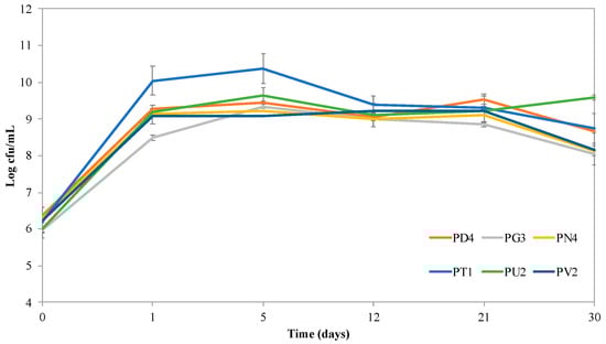 Microbial count of lactic acid bacteria in fermented pistachio-based beverages at inoculum (time zero), after 24 h fermentation (1 day), and after 5, 12, 21, and 30 days of storage at 4 °C. The labels PD4, PG3, PN4, PT1, PU2, PV2 are fermented pistachio-based beverages inoculated respectively with Leuc. pseudomesenteroides PD4, C. alimentarius PG3, L. paraplantarum PN4, L. plantarum PT1, C. kimchi PU2, L. plantarum PV2.