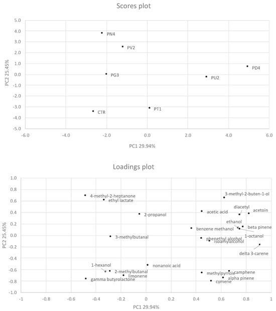Score and loading plots of the principal component analysis (PCA) of the volatile organic compound (VOC) data set of fermented pistachio-based beverages: CTR, control; PD4, PG3, PN4, PT1, PU2, PV2 are fermented pistachio-based beverages inoculated, respectively, with Leuc. pseudomesenteroides PD4, C. alimentarius PG3, L. paraplantarum PN4, L. plantarum PT1, C. kimchi PU2, L. plantarum PV2.