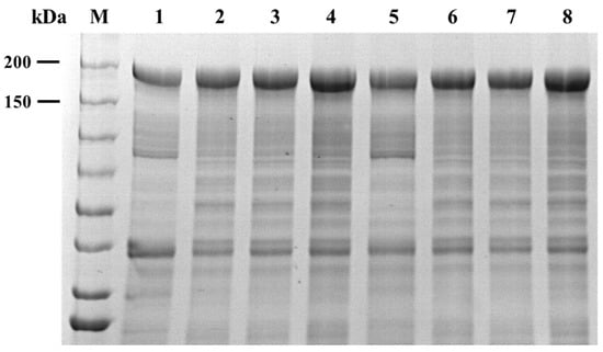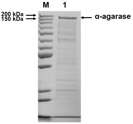 The recombinant plasmid was transferred into E. coli BL21(DE3) to produce the recombinant Cm-AGA. The harvested cells were centrifuged, collected, and disintegrated. The crude recombinant enzyme was then purified using nickel affinity chromatography and its molecular weight was estimated as 156.09 kDa [20]. The enzyme was subjected to SDS-PAGE (Figure 1). The purified Cm-AGA exhibited a single, distinct band with a molecular mass of approximately 160 kDa. This was consistent with the molecular weight predicted by DANMAN. This proved that the enzyme was successfully expressed and purified.