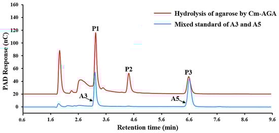 Cm-AGA (140 U/mg) was incubated with dissolved agarose (0.5% (w/v)) in 20 mM Tris-HCl buffer (pH 8.0) at 35 °C (the optimal reaction temperature) for 24 h and sampled. To evaluate the degree of polymerization (DP) of Cm-AGA’s hydrolysates, β-galactosidase was used to cut D-Gal residues [25]. β-galactosidase [26] (BR, Aspergillus oryzae extract, Shanghai Yuanye Bio-Technology Co., LTD., Shanghai, China) was added to the reaction mixture and incubated at 55 °C for another 24 h. The reactions were then terminated by boiling the mixture for 15 min. The mixture was then centrifuged at 10,000× g for 10 min, and the supernatant was filtered through a 0.22 μm filter for further analysis.