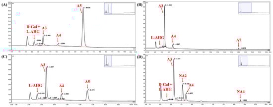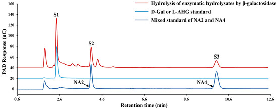 β-galactosidase is a glycoside exonuclease [25] that cleaves D-galactose residues linked by β-1-4-glycoside bonds at the non-reducing end [47]. And β-galactosidase was used to further degrade the enzymatic hydrolysates. The HPAEC-PAD analysis revealed that β-galactosidase degraded products P1, P2, and P3 to S1, S2, and S3, respectively (Figure 4). It is noted that the retention times of the peaks corresponding to D-Gal and L-AHG standards in this study were consistent (Figure 5), suggesting similar molecular weights and structures. Compared with the AGO standards, the significantly increased peaks of the obtained products corresponded to D-Gal and L-AHG, NA2, and NA4, and the corresponding molecular weights were 161/179, 323, and 629 Da (Figure 6).