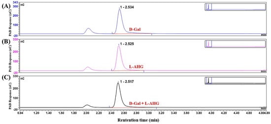 HPAEC-PAD analysis of galactose standards. (A) β-D-galactose (D-Gal) standard. (B) 3,6-anhydro-α-l-galactose (L-AHG) standard. (C) D-Gal and L-AHG mixed standards.