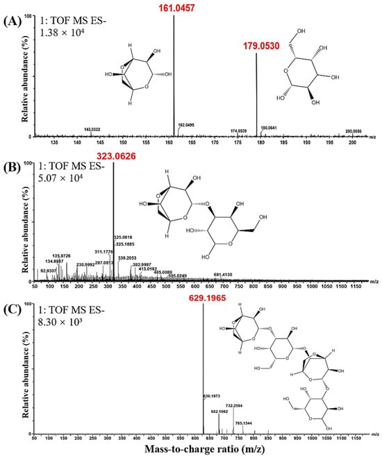 Negative ion UPLC-Q-TOF-MS diagram of the product from the hydrolysis of agarose by Cm-AGA. (A) Cm-AGA hydrolysis product P1; (B) Cm-AGA hydrolysis product P2; (C) Cm-AGA hydrolysis product P3.