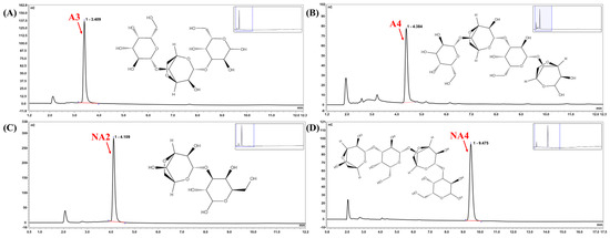 HPAEC-PAD analysis of the products obtained from the degradation of A3 (A), A4 (B), NA2 (C), and NA4 (D) by Cm-AGA.