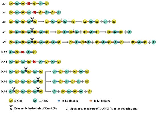 Reaction scheme of the GH96 α-agarase Cm-AGA hydrolyzing AGOs (A3, A4, A5, A7, A9, NA2, NA4, and NA6).