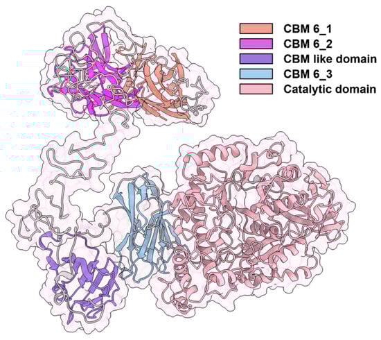 The relationship between the structure and function of Cm-AGA is currently unknown. To explore the binding sites and catalytic processes for Cm-AGA, the hydrolysis mechanism and structure–activity relationship of this enzyme need to be further evaluated. AlphaFold was used to predict the three-dimensional structure of Cm-AGA (Figure 10). According to the 3D structure model, Cm-AGA has three carbohydrate-binding module 6 (CBM6) domains for substrate binding (CBM_1, residue 1–136; CBM_2, 182–320; CBM_3, 667–802), one thrombospondin type 3 (TSP-3) domain for calcium ion binding, and one CBM-like domain consisting of nine antiparallel β layers. A typical catalytic domain structure, which contained the (α/β)6/7 barrel structure and catalytic grooves similar to those found in α-amylases in the GH13 family, was noted [49]. Therefore, this region is considered as the catalytic domain.