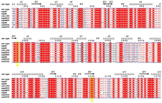 Sequence alignment of sites 900 to 1170 of α-agarase gene Cm-AGA with agaD, agaA, calj96, agaA33, agaWS5, agaE, ce2834, and ce2835. (The secondary structural components of Cm-AGA are marked above the sequence. Conservative residues are represented by red squares with white letters, while similar residues are represented by red letters. The key residues Asp994 and Glu1129 are marked with yellow boxes and triangles.)