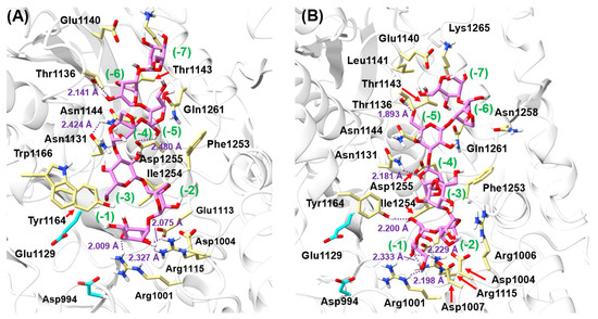 While the protein sequence remained identical, some structural rearrangement occurred on the binding A7 ligand. There are two different substrate-binding modes: in one mode, the reducing end of the A7 chain is close to the two catalytic residues, and in the other mode, the non-reducing end of the A7 chain is close to the two catalytic residues (Figure 13). Docking simulations revealed that five (Gly1133, Thr1143, Asn1144, Ile1254, and Lys1265) overlapping amino acids had hydrophobic interactions with A7, and nine (Asp1004, Glu1113, Arg1115, Asn1131, Thr1136, Glu1140, Tyr1164, Asp1255, and Gln1261) overlapping amino acids formed hydrogen bonds with A7 in the substrate-binding groove. One substrate-binding mode demonstrated that Arg1001, Trp1166, and Gly1252 bind through hydrophobic interaction force with A7. Similarly, the other substrate-binding mode showed that Arg1006 and Asn1258 can have hydrophobic interactions with A7, and Arg1001, Asp1007, and Leu1141 form hydrogen bonds with A7. In both binding modes, the aromatic amino acids Tyr1164 and Phe1253 may offer π–π stacking interactions on both sides of A7 near the catalytic cavity.