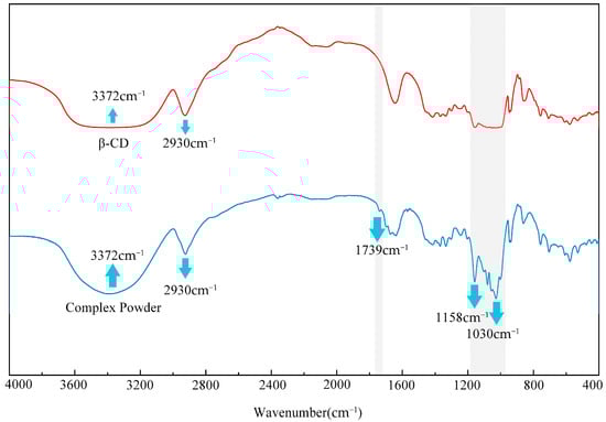 The inclusion interaction between the compounds and β-CD was further investigated using FT-IR analysis. The results are shown in Figure 2. In this study, we determined the FT-IR spectra of β-CD and the CD powder from 4000 to 400 cm−1 [48], and the formation of the inclusion complex was verified by the difference in peak positions of the spectra [49]. As shown in Figure 2, as well as the 3372 cm−1 and 2930 cm−1 typical peaks of β-CD, the CD powder has obvious additional peaks at 2360 cm−1, 1739 cm−1, 1158 cm−1, and 1030 cm−1 ascribed to encapsulated flavour substances.
