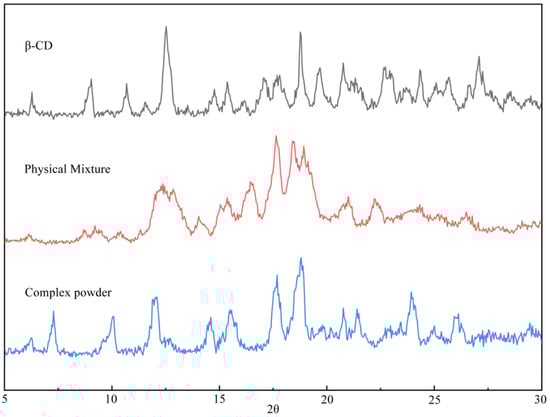 The inclusion complex formation was also verified by XRD, which has been proven to be an effective method for the analysis of inclusion complexes [50,51]. Through the results of our experiments in Figure 3, it can be seen that the XRD diffraction patterns of the β-CD inclusion complex are significantly different from those of pure β-CD and physical mixtures; the appearance of the new peaks is a result that suggests the formation of coffee aroma substance/β-CD inclusion [52,53,54]. The plots of β-CD powders have some intense and sharp peaks at diffraction angles of 2θ of 9.04°, 10.68°, 14.76°, 15.40°, 17.08°, 18.76°, 20.75°, 25.64°, and 27.08°. This suggests that the powder is present as a crystalline material [55,56]. The XRD spectra of the physical mixture of flavour components and β-CD show some typical peaks of β-CD that may be attributed to the crystalline structure, but the intensity of the peaks changes considerably, which indicates that the crystallinity of β-CD has undergone changes due to the influence of the compound. In contrast, the diffraction pattern of the inclusion complex is different from the superimposed pattern of the main and guest components. The XRD pattern of the β-CD/flavour CD powder shows the disappearance of some of the original crystalline peaks, and some new sharp peaks are observed at 2θ of 7.24°, 10.12°, 14.44°, 15.56°, 17.68°, and 4.16°, respectively [57].