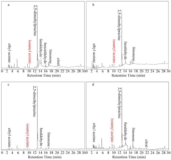 SDE-GC-FID chromatograms for Coffee #1, Coffee #2, Coffee #3, and Coffee #4. (a) sinloy yixia (b) sinloy landong (c) sinloy yishijiaotang (d) sinloy mandheling.