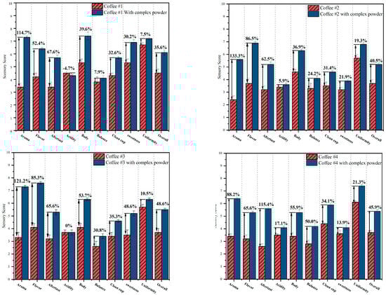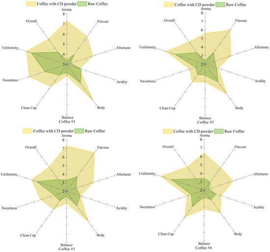 Figure 6 shows the comparison charts before and after addition of CD powders to four different original coffees. Compared to the original coffees, the results showed that the sweetness of coffee was up 0.5 to 1.7 points after adding CD powder. This should be related to the nature of the cyclodextrin itself [75]. In terms of uniformity, CD powder works steadily in each cup of coffee and improves the quality of the coffee.