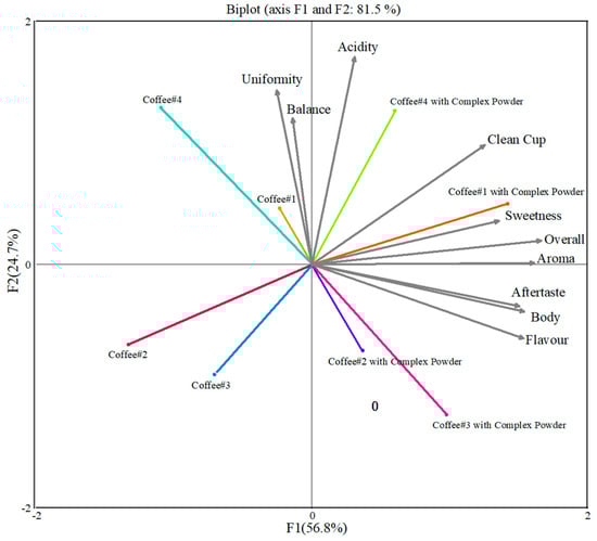 PCA (principal component analysis) was performed on the sensory data obtained from the coffee cup test using Origin (2021) software, and the results are shown in Figure 7. From the experimental analysis, two principal components were obtained; the first one contributed 56.8%, and the second one contributed 24.7%. The cumulative contribution of the two was 81.5%, which indicates that these indicators of coffee are basically representative of the measured compositional indicators and indicates that these indicators have an important contribution to the sensory flavour of coffee. Figure 7 depicts PCA loading plots of the sensory evaluation of coffee samples before and after addition of CD powder.