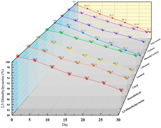 Figure 8 shows the results of retention rates of inclusion compounds changing with time under the sealed environment of 25 °C. The data showed that the loss rate of the volatile substances in the inclusion complex was less than 20% in one month. It also proved that the inclusion complex has a good embedding effect, strong stability, and good sustained release performance.